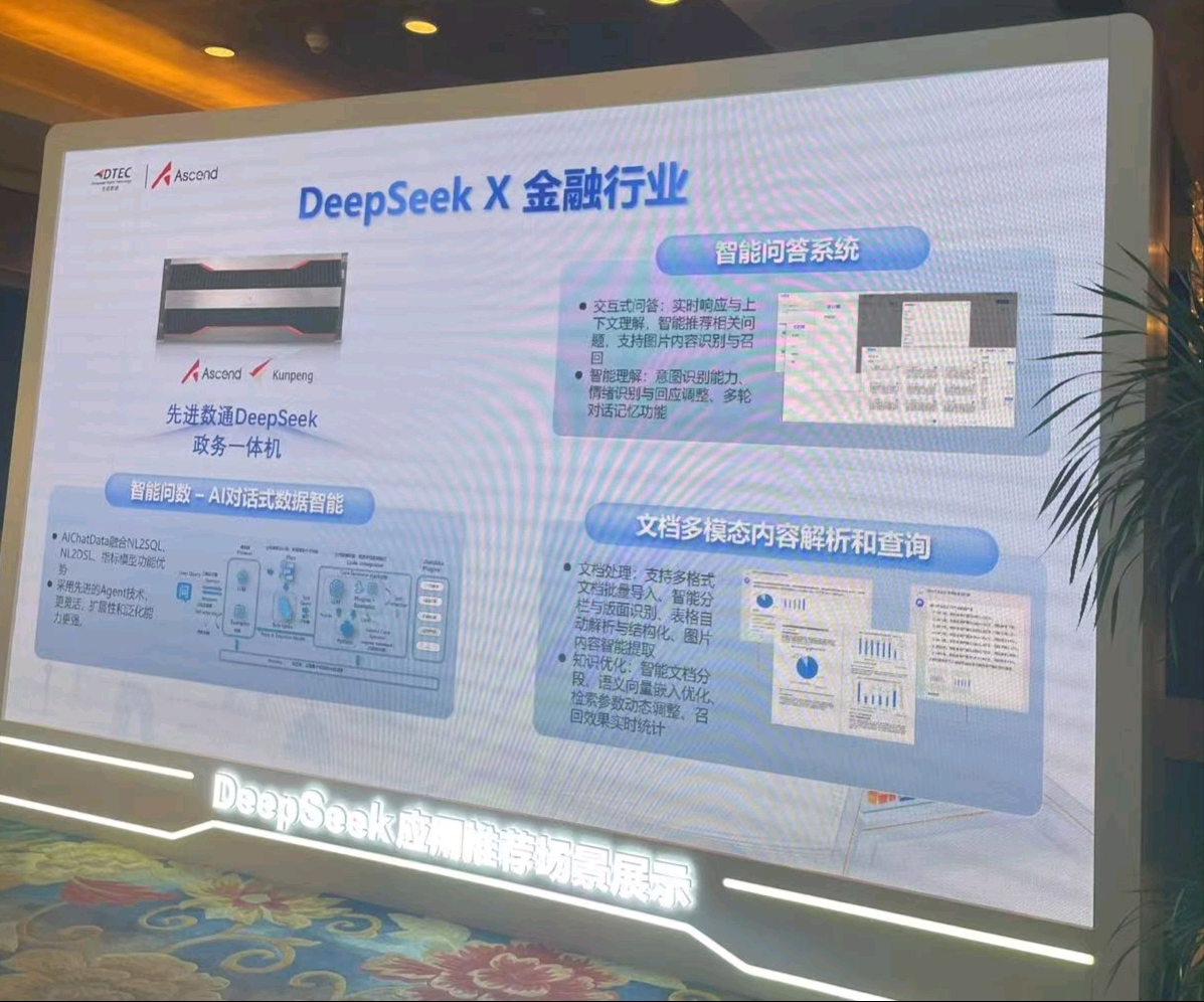本次大会平安陆金所展示了DeepSeek一体机,向业界全方位展示了其在金融科技领域的创新实力。平安陆金所DeepSeek一体机的文档多模态内容解析和查询功能备受瞩目。它能够对各类金融文档,如研究报告、监管文件、交易记录等进行全方位解析,将文本、图表、图像等多模态信息转化为可高效查询和分析的结构化数据。金融组织借此可快速定位关键信息、洞察市场趋势、防范合规风险,为决策给予有力支持,实现从数据到价值的高效转化。